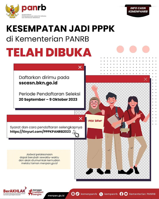 Sehubungan dengan pengadaan Aparatur Sipil Negara (ASN) tahun anggaran 2023, bersama ini kami sampaikan bahwa Kementerian Pendayagunaan Aparatur Negara dan Reformasi Birokrasi membuka kesempatan kepada Warna Negara Indonesia untuk menjadi ASN yang akan ditugaskan dilingkungan Kementerian Pendayagunaan Aparatur Negara dan Reformasi Birokrasi dengan kententuan pada pengumuman berikut ini: