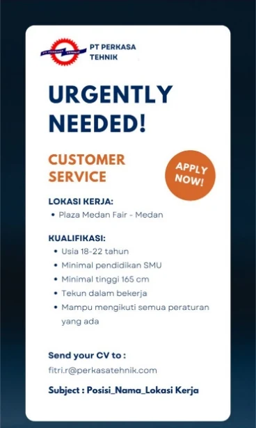 Lokershareinone Official, Medan | Saat ini, PT Perkasa Tehnik membuka lowongan kerja di kota Medan untuk posisi berikut ini: